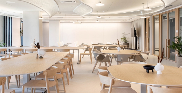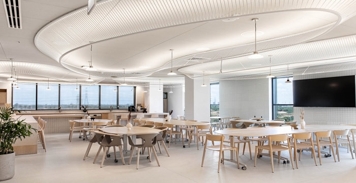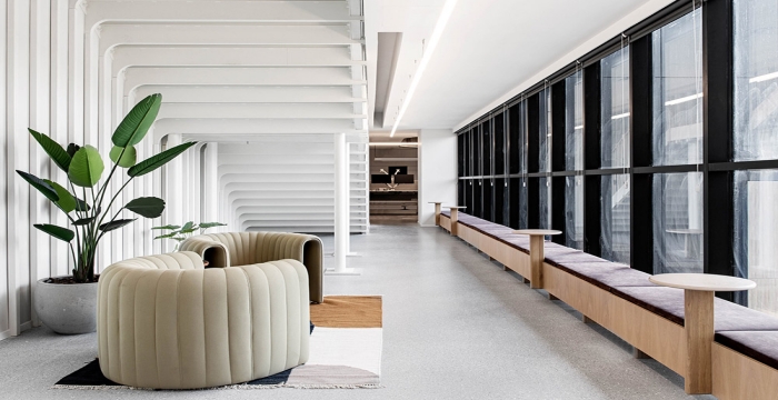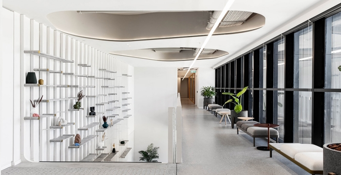 設(shè)計(jì)師將材質(zhì)、定制元素、形式和圖案組合賦予空間靈魂。最直觀的表達(dá)體現(xiàn)于室內(nèi)天花的構(gòu)造上,有機(jī)形式的開放式天花設(shè)計(jì),局部裸露出頂面的管道機(jī)械系統(tǒng)。另一個(gè)就是位于餐廳的獨(dú)特頂面裝置,其形式來自于對四個(gè)心腔輪廓的模擬。這組三維裝置強(qiáng)化了客戶的行業(yè)屬性和奮斗的目標(biāo),為空間帶來與眾不同的體驗(yàn)。