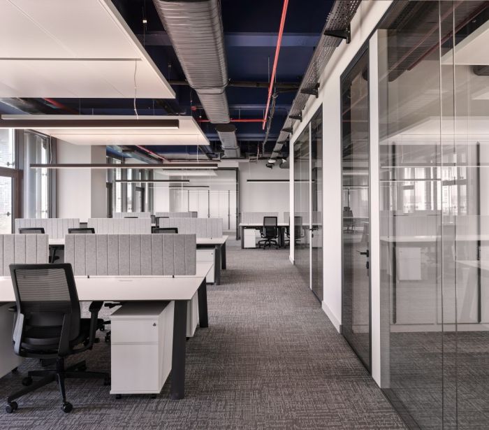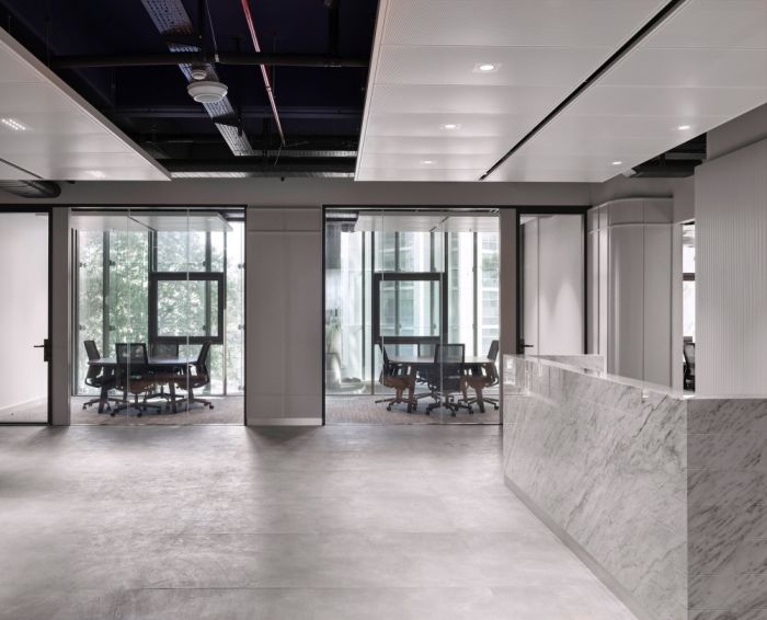 在該項目中,人力行政部門位于一樓;技術(shù)部門位于二、三樓。會議室和休閑區(qū)也根據(jù)需要布置在每一層。整體空間的白色調(diào)用于營造寬敞的氛圍。天花板被漆成深藍(lán)色,同時使用灰色調(diào)的技術(shù)設(shè)備,提供統(tǒng)一性。會議室和行政室的家具、柜臺以及儲藏室均采用定制,而開放式工作區(qū)則采用標(biāo)準(zhǔn)辦公家具。