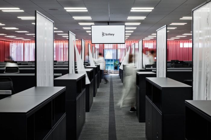 辦公室的設(shè)計(jì)意圖是利用空間各處促進(jìn)人們對Bitkey業(yè)務(wù)的認(rèn)識(shí)。沿著通道懸掛的大型帷幔體現(xiàn)了Bitkey產(chǎn)品的意圖和顏色,不僅提升了品牌形象,而且通過區(qū)域之間的舒適過渡實(shí)現(xiàn)了空間的多樣化使用。獨(dú)特的交流休息室在整個(gè)設(shè)計(jì)中融入了公司文化,成為分享Bitkey核心信息的場所。辦公室的內(nèi)部技術(shù)工作中心消除了團(tuán)隊(duì)之間的隔閡并促進(jìn)員工之間的協(xié)作辦公。