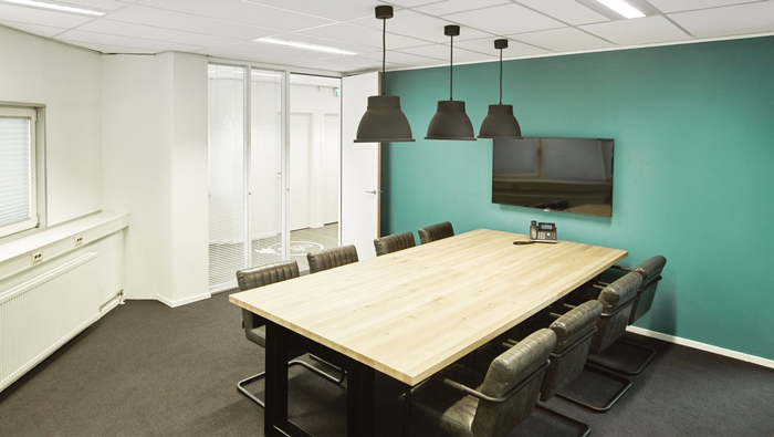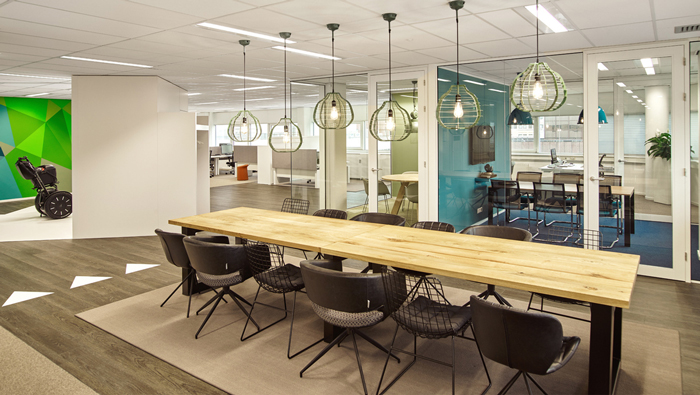 會(huì)議室的設(shè)計(jì):相信大家看到很多會(huì)議室都是封閉式的,此處設(shè)計(jì)師提出了一個(gè)新的想法,就是打造一處開放式的會(huì)議室,但開放式不是說設(shè)計(jì)就設(shè)計(jì)的,而是要觀察四周的格局是否能夠完成,最后發(fā)現(xiàn)此處剛好處于菱形空間的中心區(qū)域,其他區(qū)域?qū)Υ颂幍挠绊懳⒑跗湮ⅰ?/span>