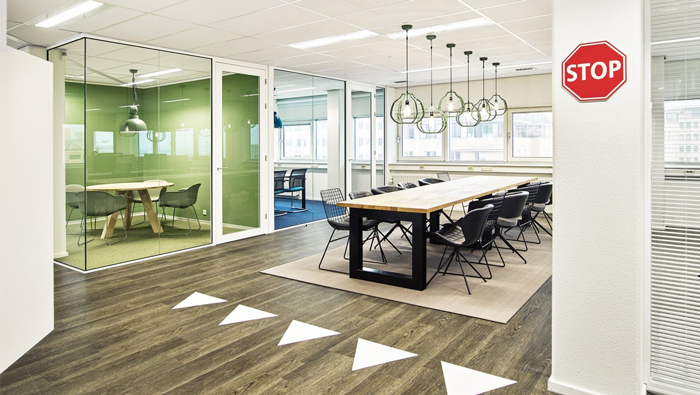 動(dòng)線的設(shè)計(jì):通過地上的標(biāo)志大家有沒有想到什么,對的你沒有想錯(cuò),就是交通圖標(biāo),這是設(shè)計(jì)師受到交通圖標(biāo)的啟發(fā),認(rèn)為空間的動(dòng)線不僅要滿足人走也要滿足代步車走,這樣交通圖標(biāo)就不可缺少,讓彼此各行其道,紅色的STOP提示著此處不通、請繞行,避免了對辦公區(qū)域的影響。