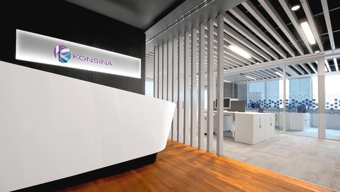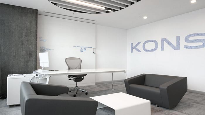 進(jìn)門區(qū)域的設(shè)計(jì):設(shè)計(jì)師在設(shè)計(jì)的時(shí)候,結(jié)合空間的實(shí)際情況,最后決定采用去前臺(tái)的設(shè)計(jì)手法,這樣一來一方面可以進(jìn)一步深化辦公流程,另一方面也可以彌補(bǔ)空間的不足,流線型的白色造型加上白色logo墻與彩色logo,也為企業(yè)帶來了一絲靈動(dòng)或活力。