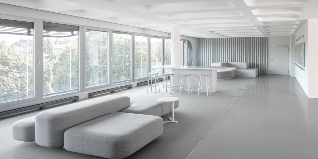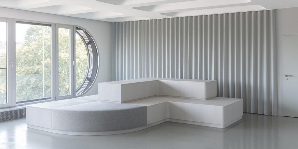 采用整體方法并將其轉(zhuǎn)化為物理概念,將三樓一個大空地周圍的新空間分為三個部分:一個座位區(qū)、一個長吧臺和一個有自己工作墻的舞臺。地毯和窗簾是用來標(biāo)記之間的過渡地區(qū),同時也改善了聲學(xué)。
