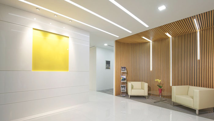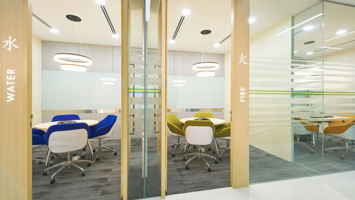 接待區(qū)域的設(shè)計(jì):因?yàn)槠髽I(yè)業(yè)務(wù)的私密性較強(qiáng),故此對(duì)于接待區(qū)域的私密性就有很高的要求,每一個(gè)接待區(qū)域都是由隔音玻璃組成,這樣是為了打造絕對(duì)安靜、隔音的空間,同時(shí)設(shè)計(jì)師以水、火、木、金、土對(duì)5個(gè)接待區(qū)域進(jìn)行命名,這樣的命名即好記也有循環(huán)往復(fù)的含義。