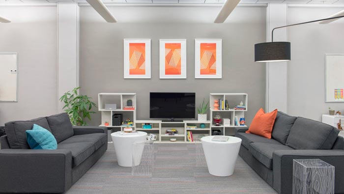 休息區(qū)域的設(shè)計(jì):此處的設(shè)計(jì),設(shè)計(jì)師參考了家庭客房的設(shè)計(jì),設(shè)計(jì)師希望讓員工在休息之余,可以有事情可做,在這里可以看看電視,互相追追劇,讓員工的休閑時(shí)間更加多姿多彩,讓員工在此處感受到家的氛圍,這樣更能促進(jìn)創(chuàng)意的產(chǎn)生,同時(shí)此處也可以做為交流區(qū)域,促進(jìn)企業(yè)與客戶之間的距離。