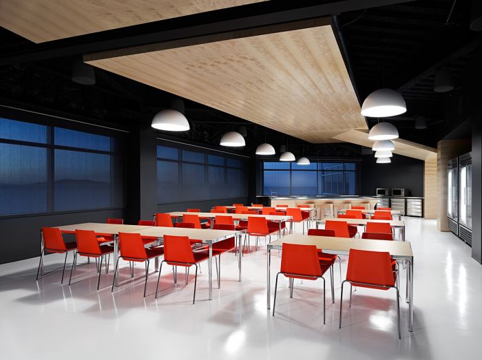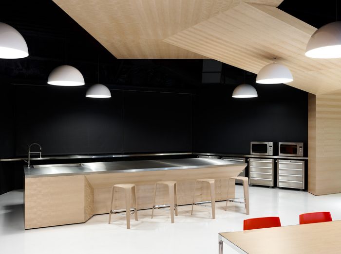 整個設計的空間感很強,線條硬朗,色彩柔和。在會議室和冥想空間內(nèi)采用了品牌色,更加有品牌感。開放式咖啡廳可以作為大會議室和展示空間使用。