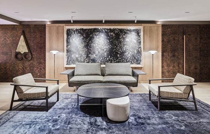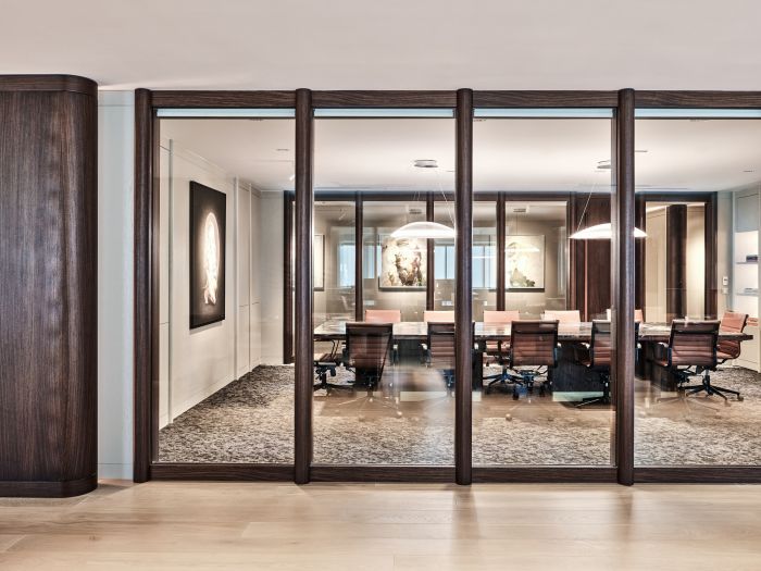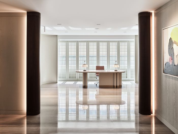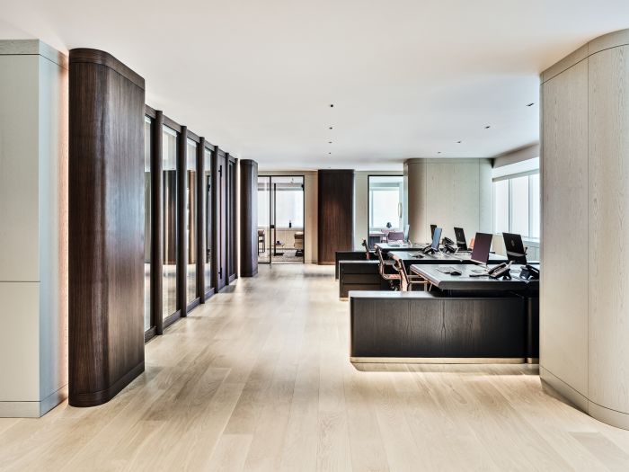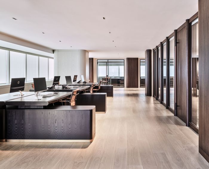 所有的辦公室都是開放式設(shè)計(jì),透明玻璃門劃分了工作區(qū)域。從接待區(qū)到工作區(qū),木材材料逐漸使用,所以整個(gè)辦公室的調(diào)色板以米色和棕色為主。該項(xiàng)目的主要棕色色調(diào)以木質(zhì)元素和 大理石細(xì)節(jié)為特色。