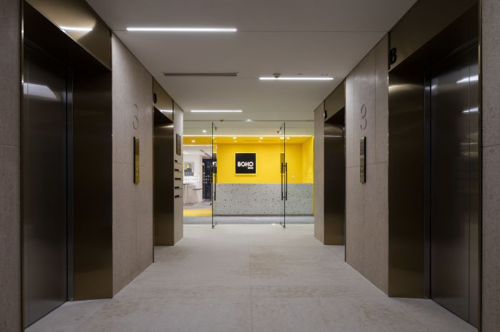 這是一個780方的辦公室, 辦公室受熱鬧喧嘩的城市街道和有限的視野影響,在設(shè)計(jì)上遇到了較大的挑戰(zhàn)。因此,設(shè)計(jì)團(tuán)隊(duì)的解決方案是在室內(nèi)打造一個核心焦點(diǎn),讓人們的視線都聚焦于此,有意識的讓人們忽略外部世界。