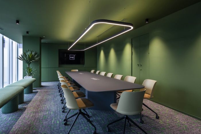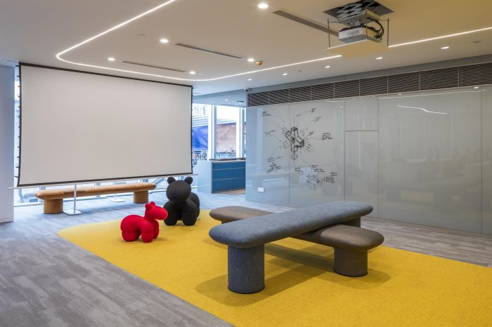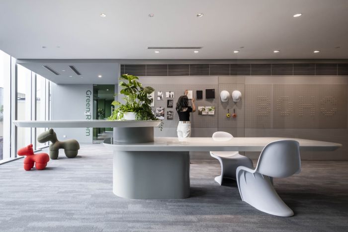 他們試圖打造一個能展現(xiàn)企業(yè)文化并能激發(fā)團(tuán)隊(duì)熱情的辦公場所。所以空間減少了實(shí)體隔墻,以展現(xiàn)開放的辦公文化。運(yùn)用塊面色彩、幾何形式、通透的玻璃隔墻去界定各功能區(qū)域,形成沒有視覺阻隔的開敞空間感。這樣的設(shè)計(jì)也正好契合公司致力于互動與協(xié)作的工作精神。
