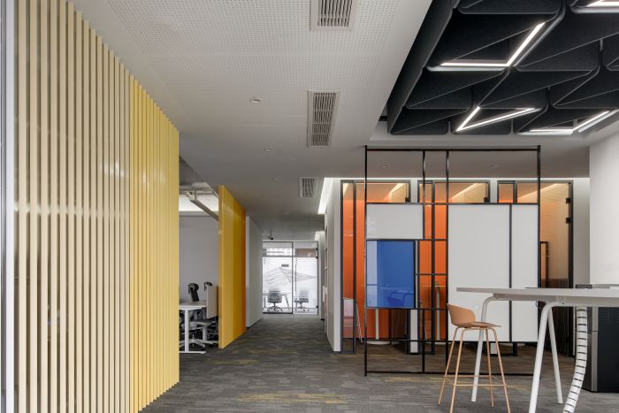 前臺(tái)空間使用了白色大理石材質(zhì),整體風(fēng)格簡潔優(yōu)雅??臻g右側(cè)使用企業(yè)的品牌色黃色和橙色設(shè)置了一個(gè)線條隔斷,用于分隔入口區(qū)域和辦公區(qū),保護(hù)企業(yè)辦公空間的隱私??臻g讓來訪者感覺流暢現(xiàn)代,同時(shí)也充滿了企業(yè)的個(gè)性。
