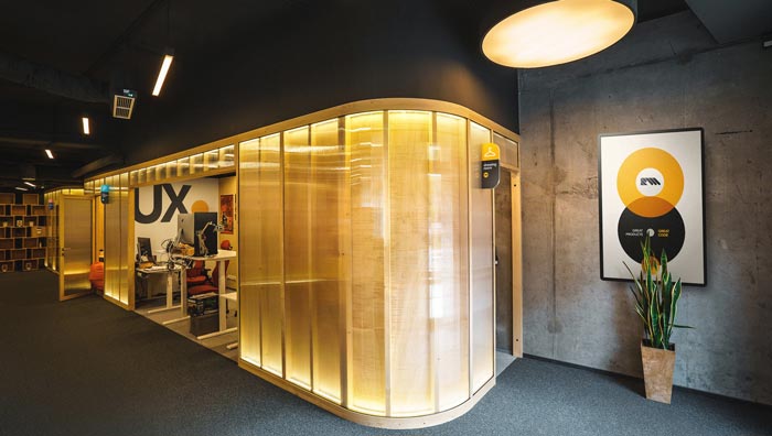 編碼室的設(shè)計(jì):內(nèi)外之間有一種別樣的感覺,外部空間以暗色為主,內(nèi)部空間以暖色為主,兩種色彩相互結(jié)合在一起,卻給我們展現(xiàn)了神奇的一面,暗色的頂與過道給程序員營造了一個(gè)絕對(duì)安靜的空間氛圍,暖色系讓空間更加的溫馨,這樣的搭配主要就是希望給程序員一種家的感覺,消除程序員的煩躁與無聊。