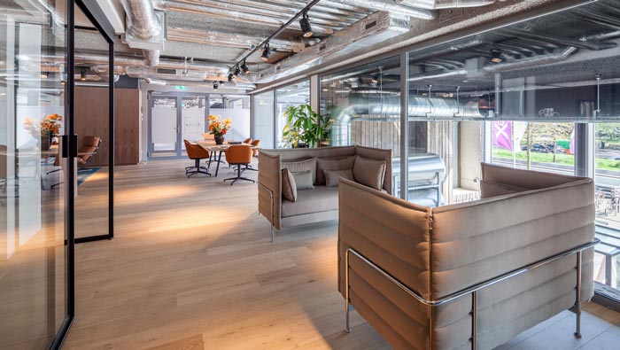 交流區(qū)域的設(shè)計:此處位于窗邊,設(shè)計師在選擇的時候特意選用開放與私人一體的沙發(fā),這樣的好處就是在不影響空間的前提下,保證交流不會被打擾,交流的雙方坐在此處可以一邊欣賞外界風(fēng)景,可以一邊進行商務(wù)交流,這樣的交談方式讓人感到新穎與貼切,讓交流在愉悅的氛圍下展開。