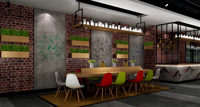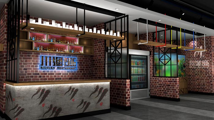 川漁館前臺裝修設(shè)計:紅磚為空間帶來了一種記憶色彩,川漁館的理念就是帶來記憶中的味道,在地地道道的川菜館中,嘗到川菜最地道的味道,讓客戶體驗川菜最初的味道。