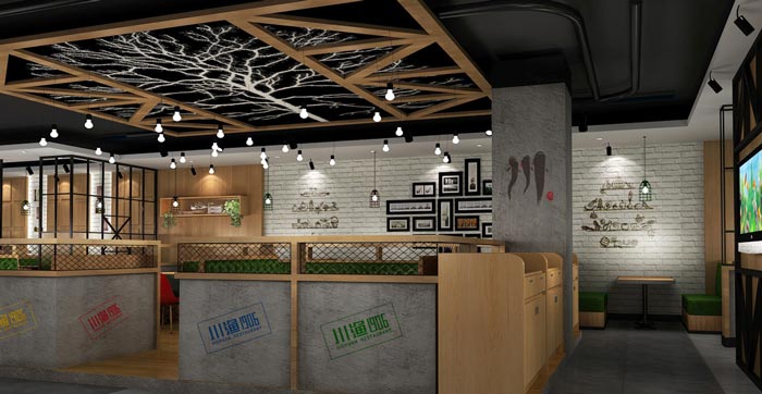 川漁館過道裝修設(shè)計:中間區(qū)域雖然被利用了起來,但是對于整個空間的影響幾乎沒有,過道根據(jù)各個區(qū)域的特色進(jìn)行設(shè)置,目的就是希望過道、餐區(qū)、空間可以完美的融合為一體。