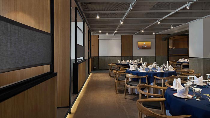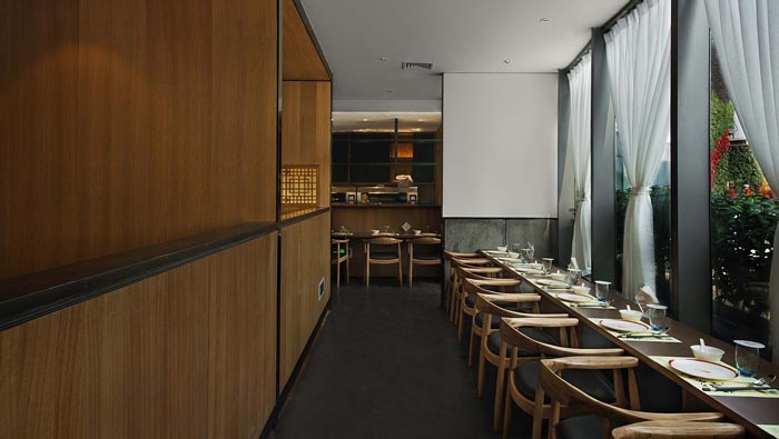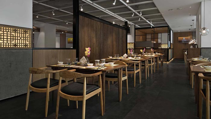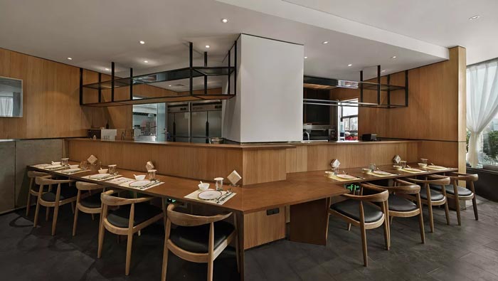 特色川菜館廚房餐區(qū)設計:設計師在廚房外圍的周邊,打造了一處直角餐區(qū),客戶可以邊就餐,邊看到廚房的情況,讓客戶吃的放心、吃的安心,同時也為餐館營造了10個餐位。