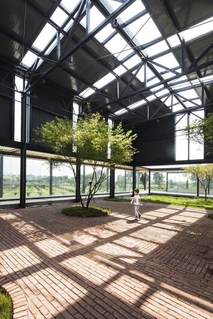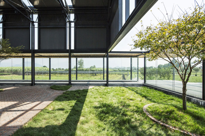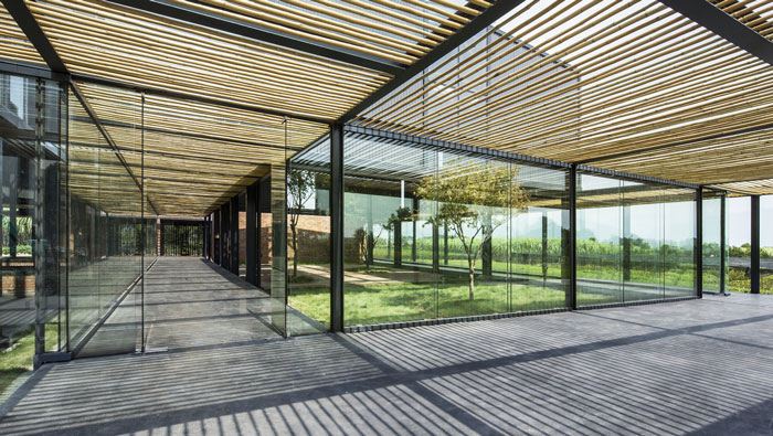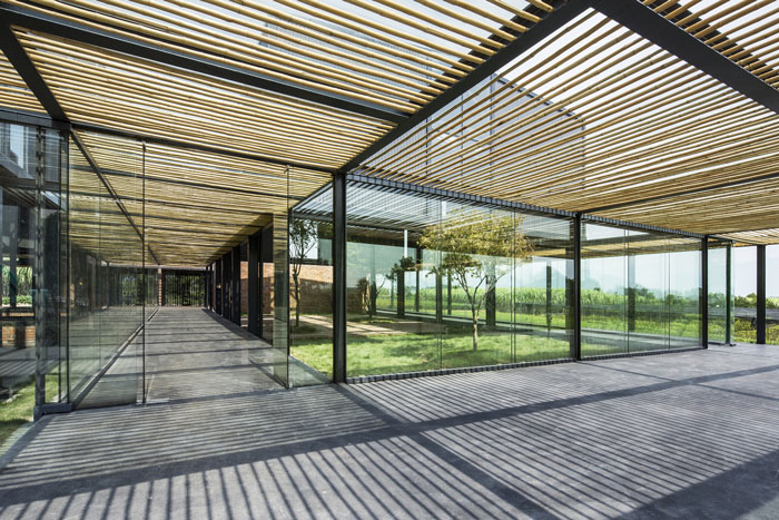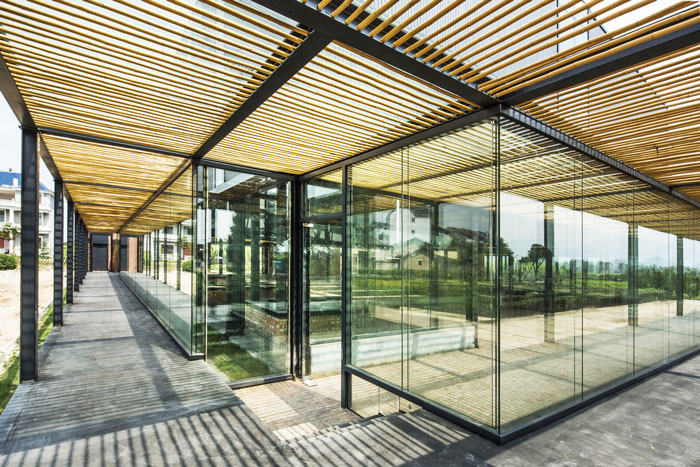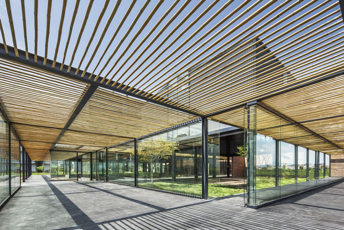 紅糖廠房外部進(jìn)門(mén)區(qū)裝修設(shè)計(jì):這里是連接進(jìn)門(mén)處、和外部的區(qū)域,連廊的設(shè)計(jì)即可以抵擋陽(yáng)光,同時(shí)又保證了空間的通透,木材都是做過(guò)防水處理的,這樣可以保證內(nèi)部綠植的生長(zhǎng)。