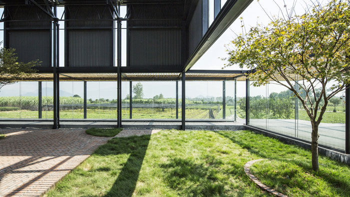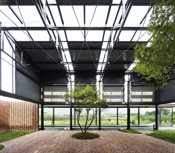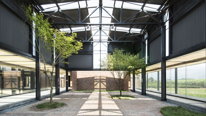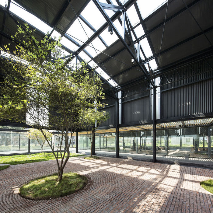 紅糖廠房進(jìn)門(mén)連廊裝修設(shè)計(jì):連廊的設(shè)計(jì)可以抵擋強(qiáng)烈的陽(yáng)光,同時(shí)微風(fēng)也可以保證空間的通透,之所以不做防雨措施,就是為了保證空間的通透,同時(shí)讓室內(nèi)綠植快樂(lè)的成長(zhǎng)。