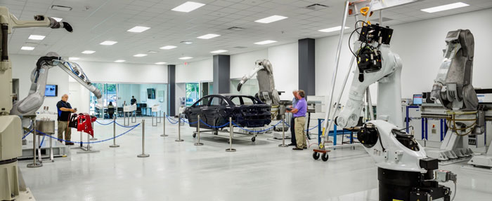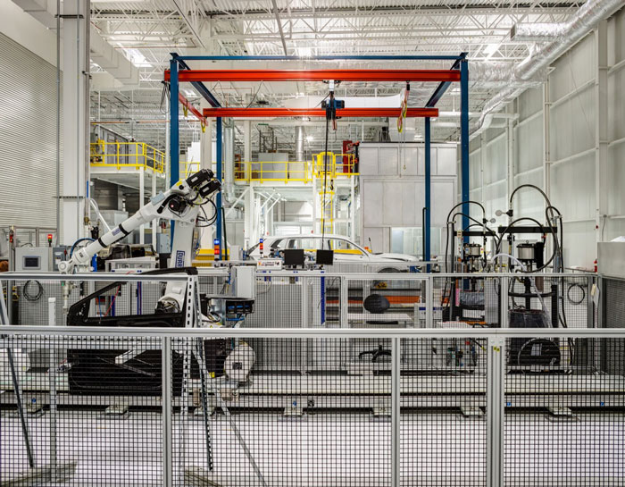 汽車工廠車間裝修設(shè)計(jì):這里是機(jī)器人給汽車原型,進(jìn)行上裝的地方,機(jī)器人搭配先進(jìn)的涂料系統(tǒng),將各種涂料按照原本的計(jì)劃,一步不差的涂抹在車身,車輛上裝在這里完成。