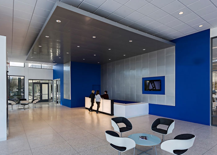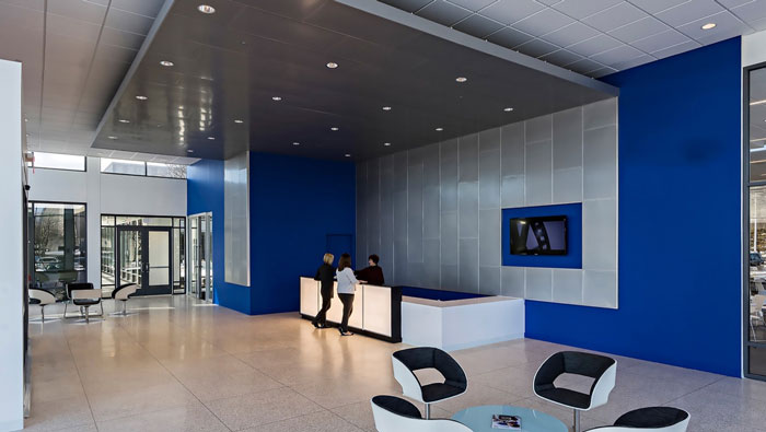 汽車工廠前臺裝修設(shè)計(jì):這里融合了前臺區(qū)、接待區(qū),前臺主要用來接待,接待區(qū)主要用來休息,待人接物是設(shè)計(jì)師首先要解決的問題,這樣的空間氛圍表示著企業(yè)的理念。