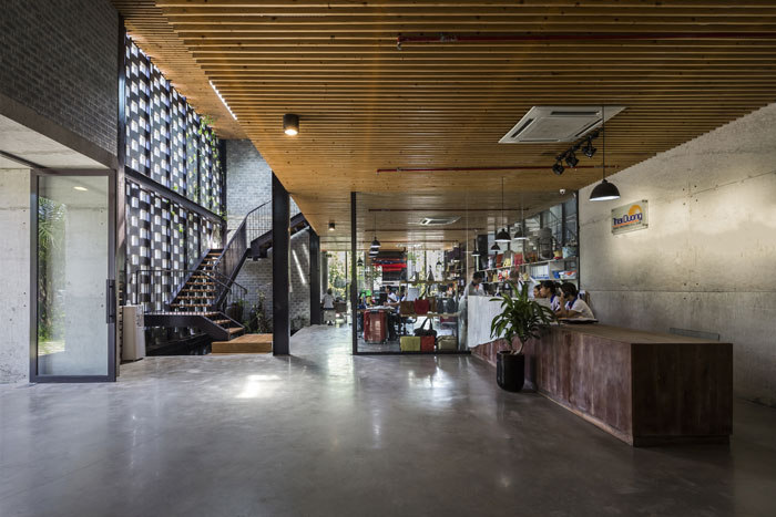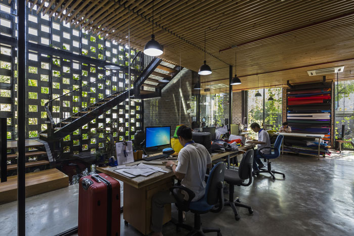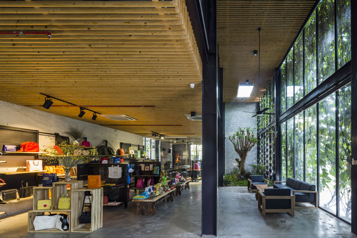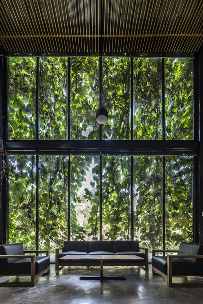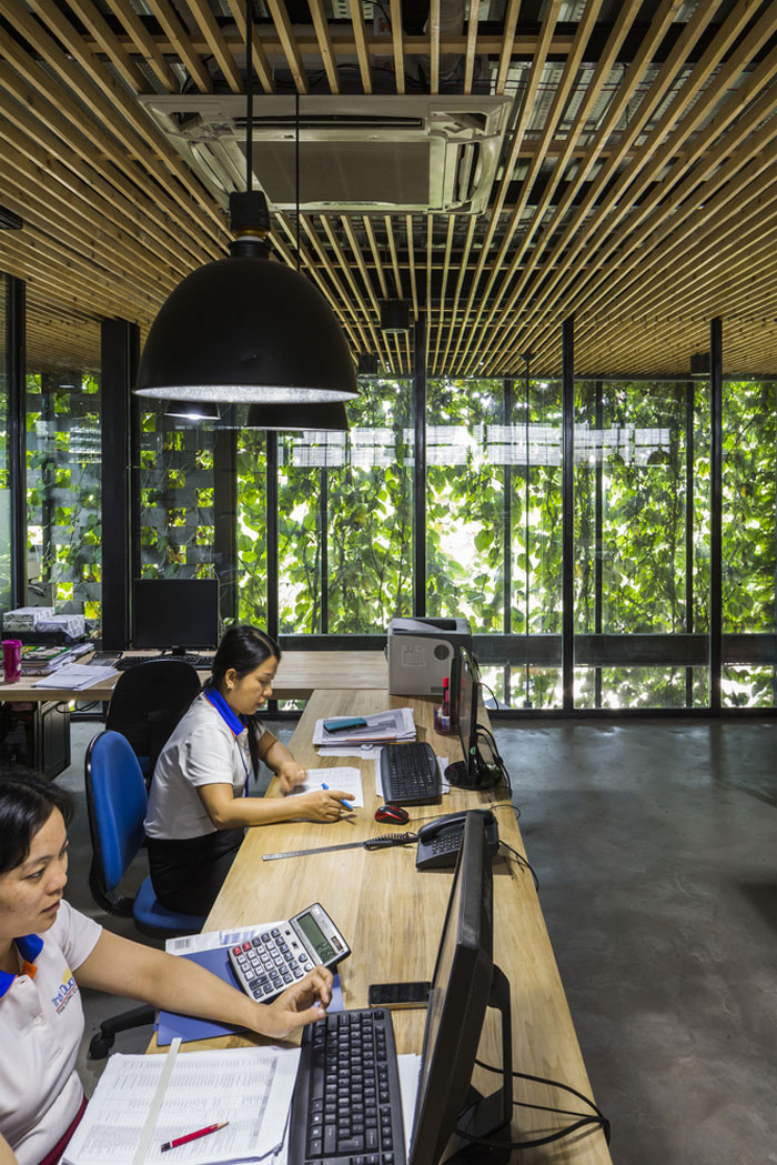 服裝廠房二樓辦公區(qū)裝修設計:綠色在整個空間隨處可見,這都歸功于外界的綠植藤蔓,這些天然的綠植,將空間裝扮得自然、舒適,這也正是自然的魅力,廠區(qū)與自然和諧相處。