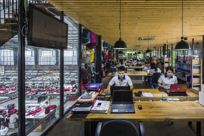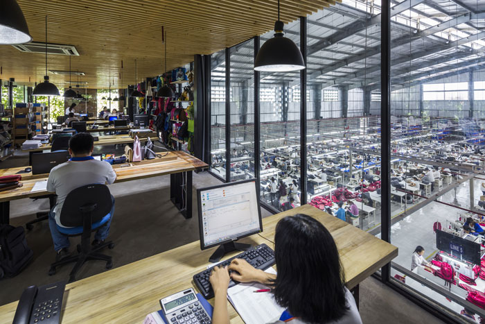 服裝廠房二樓辦公區(qū)裝修設計:整個空間沒有采用任何隔斷墻、或封閉的房間進行隔離,目的就是希望打造一個開放式的空間,旨在減少車間工作人員的壓力,讓空間宛若一體。