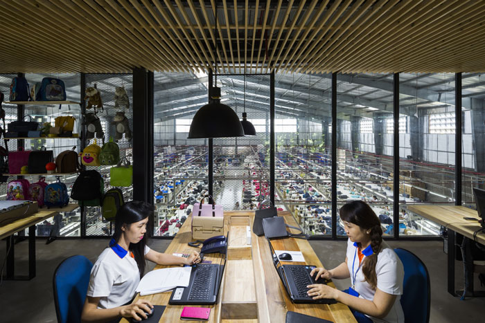 服裝廠房二樓辦公區(qū)裝修設計:這里主要記錄的是產(chǎn)品的數(shù)量、完成數(shù)量等一系列的數(shù)據(jù),上面可以看到下面,下面可以看到上面,讓整個空間宛如一體,看起來其樂融融。