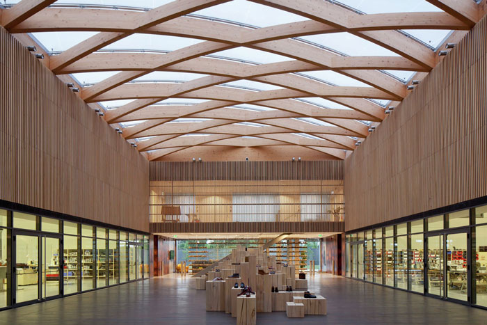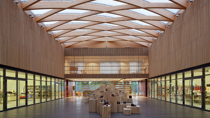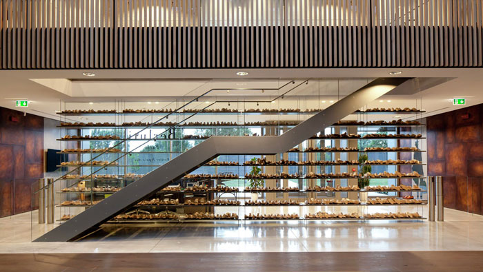 工廠廠房大堂裝修設(shè)計:進(jìn)入大堂后,可以看到這里擺放著各式各樣的樣板鞋,這里既做為展示區(qū),同時也做為樣板區(qū),一個區(qū)域多個功能,正是設(shè)計師對功能區(qū)域的定位。