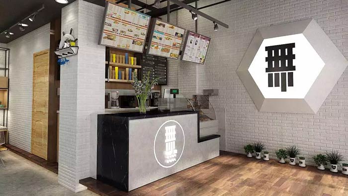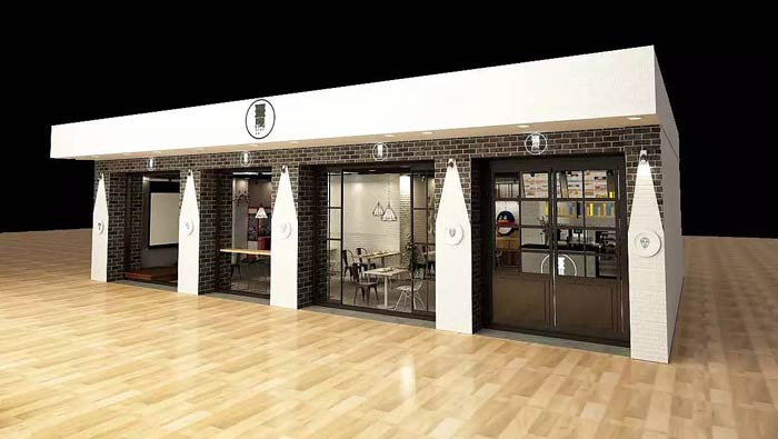 茶飲茶餐廳外立面設(shè)計(jì):白色的屋頂加上黑色的logo設(shè)計(jì),在空間中十分醒目,門、透明窗戶兩邊都由白色的鉛筆狀組成,整個(gè)空間的格局井然有序,讓整個(gè)空間簡(jiǎn)潔、明朗。