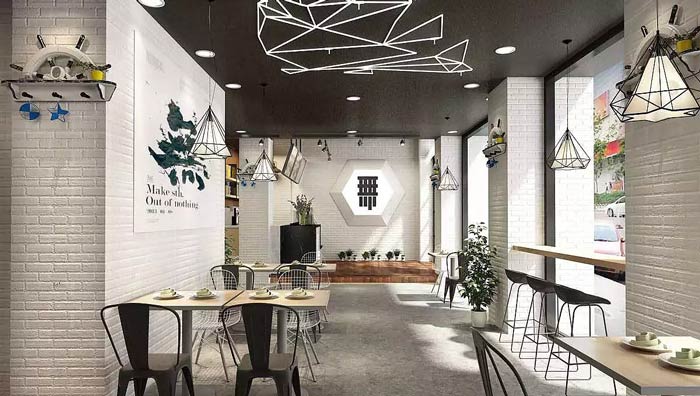 茶飲茶餐廳餐區(qū)設(shè)計(jì):整個(gè)空間分為2人區(qū)、4人區(qū)、吧臺(tái)區(qū),年輕人可以在這里稍事休息、充充電,這里是客戶休息的驛站,客戶在這里汲取能量,當(dāng)出了這個(gè)門之后,大步向前。