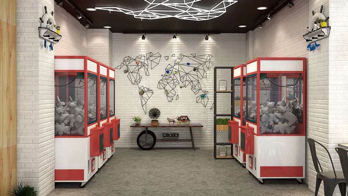 茶飲茶餐廳娃娃機(jī)設(shè)計(jì):娃娃機(jī)是不占空間的娛樂項(xiàng)目,年輕人在這里休息的同時(shí),也可以玩玩娃娃機(jī)娛樂一下,這樣可以有效的調(diào)節(jié)情緒,這里是客戶心靈的港灣。