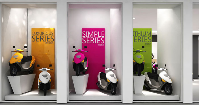 設(shè)計(jì)理念:設(shè)計(jì)師在設(shè)計(jì)之初,首先考慮到就是顧客見到店面的第一感覺。因?yàn)轭櫩瓦M(jìn)到店面之后第一眼看到的就是電動(dòng)車烤漆的顏色,這樣就會(huì)直接影響到顧客的第一眼感覺。設(shè)計(jì)師在設(shè)計(jì)的時(shí)候都會(huì)盡最大的努力把顏色作為重要的考慮。把顏色盡最大化的展現(xiàn)出來(lái),讓白天陽(yáng)光照射下來(lái)之后,會(huì)感覺到漆面顏色亮麗出彩,這樣就可以盡最大努力的讓用戶來(lái)的第一眼就對(duì)店面有一個(gè)很直觀的看法,可以贏得用戶的好印象。
