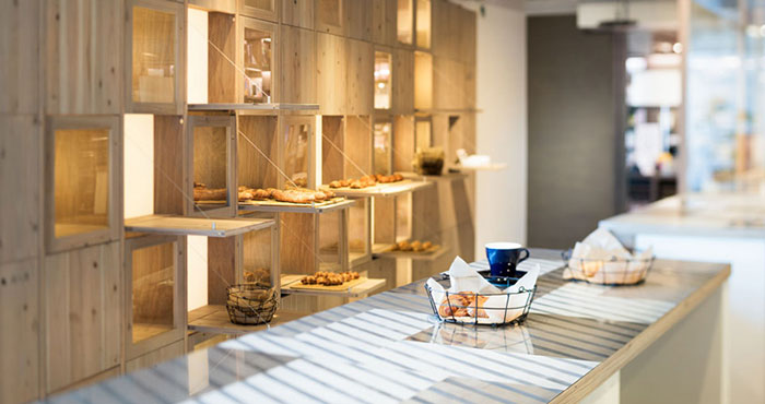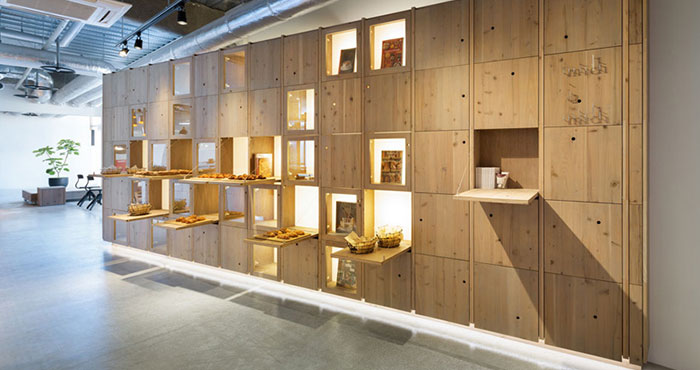設計理念:店內(nèi)色調(diào)素雅,以木質(zhì)材料為主,簡約且現(xiàn)代化。選擇開放式的廚房,表現(xiàn)出所有的面包糕點都是新鮮出爐。天花板直接將設備管線裸露,各類風格迥異的吊燈設計也透露一股現(xiàn)代工業(yè)氣。提供了三種不同類型的座位:吧臺型、公共長桌型和榻榻米風格的坐席,供顧客自由選擇。設計了一個類似集裝箱的展示平臺,為了展示不同類型的點心,希望鼓勵通過這個平臺讓顧客發(fā)現(xiàn)自己想吃什么最值得一提的是,這家簡約風格的糕點店,特意為顧客設計了一塊閱讀區(qū)域,就像圖書館一樣,提供各類書籍。在享受美味的同時還能豐富精神食糧,這樣的小店雅致,美好!