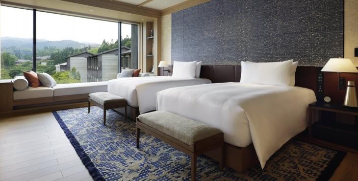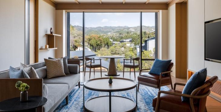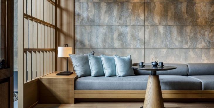 整個(gè)酒店的室內(nèi)設(shè)計(jì)與場(chǎng)地的自然環(huán)境相輔相成,這得益于設(shè)計(jì)事務(wù)所受到傳統(tǒng)日本色彩的啟發(fā),以溫暖的泥土色為空間基調(diào)。酒店客房區(qū)域,標(biāo)準(zhǔn)客房和套房的面積從50㎡到110㎡之間,雖大小不等,但都配置了舒適的沙發(fā)床和開(kāi)放式概念浴缸,讓客人更好的體驗(yàn)傳統(tǒng)京都里的泡湯文化。