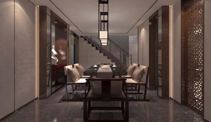 設計理念:此新中式別墅裝修設計,吸取了傳統(tǒng)裝飾‘’形‘神’的特征,糅合現(xiàn)代西式家居的舒適。