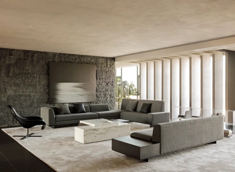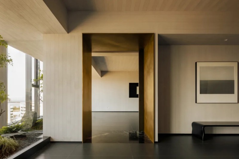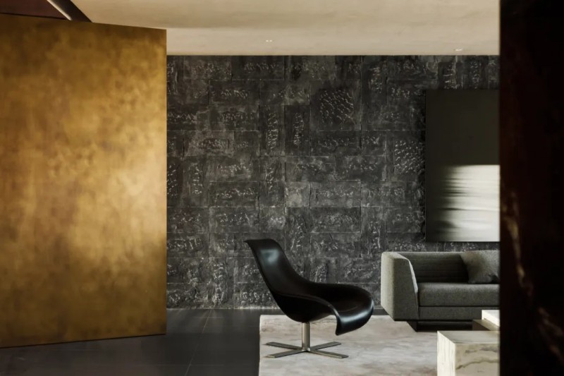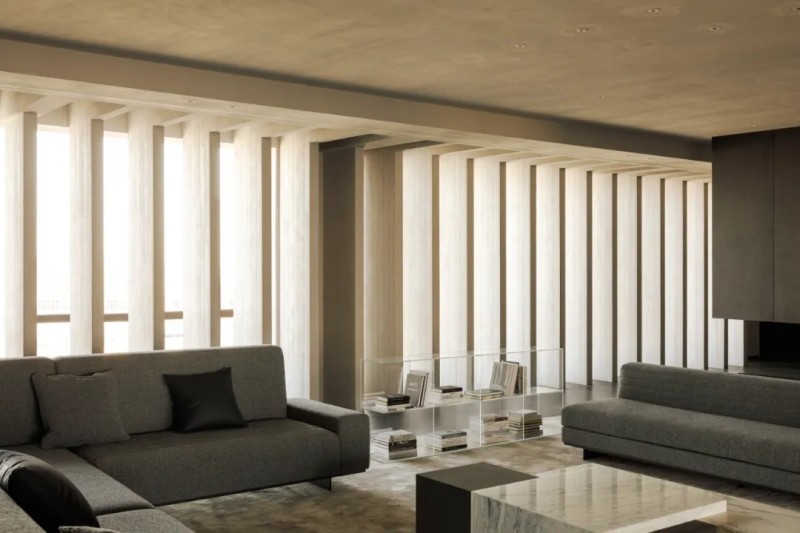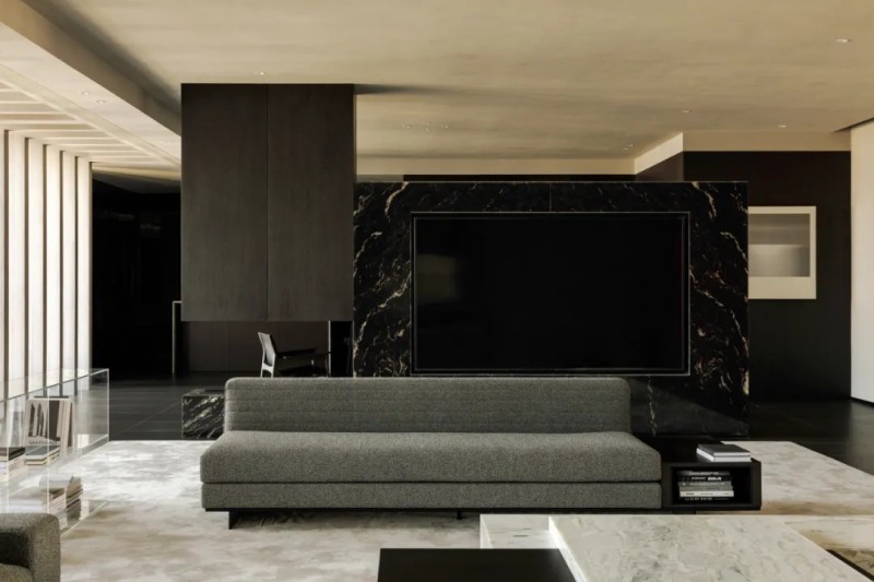 整體材質(zhì)幾乎是藝術(shù)微水泥,肌理與色彩給予更沉浸式的簡約素樸,對撞局部的仿銅與大理石,凸顯空間氛圍的厚實(shí)與精細(xì),也在簡約中增加豐富性。