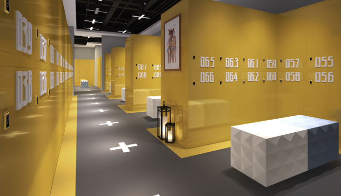 從門口進入,先會經過更衣室,設計師在更衣室的設計上,采用橘紅色為主色調,橘紅色鮮艷醒目,有利于導航,用于交通警示標志,與地面灰色相結合,更加利于導航的建立和讓消費者清晰明了。