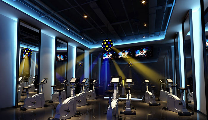 動感單車空間設計,設計師在此處采用了暗色作為主色調,讓消費者在此處可以體驗到狂野、奔放的動感單車健身環(huán)境。