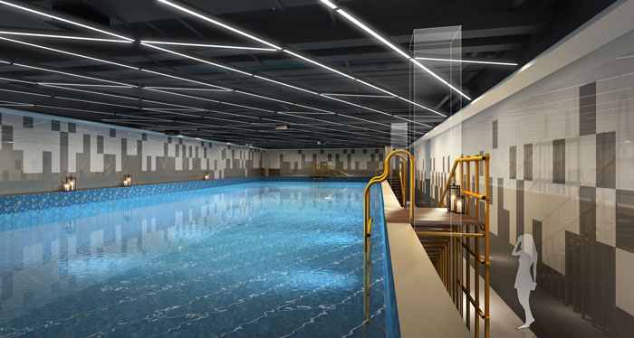 游泳區(qū)域的設計,設計師盡可能的擴大浴池的面積,在走道的設計上,設計師對過道進行壓縮,壓縮后的過道既合理又安全。