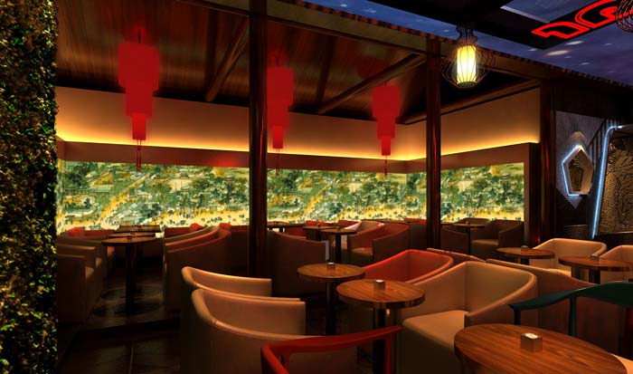 設(shè)計(jì)師裝修設(shè)計(jì)的酒吧,裝潢考究,寬敞周正,古香古色,氣度不凡,院子用玻璃封頂,通透豁亮,還能登高觀景乘涼。