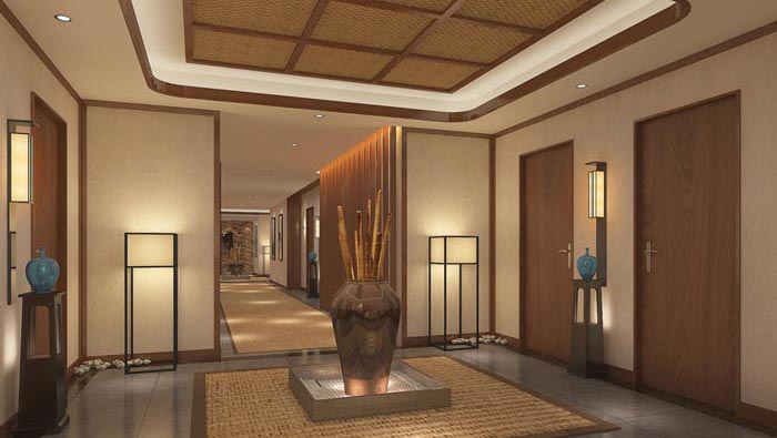 走廊的設(shè)計(jì):到達(dá)走廊首先就要經(jīng)過玄關(guān),而玄關(guān)的作用就是讓兩個(gè)空間自然轉(zhuǎn)換,渾厚古典的瓷器為空間增添了一種古樸之美,設(shè)計(jì)師在設(shè)計(jì)中將走廊描繪的沉雅而渺遠(yuǎn),其中渾厚古典瓷器與簡約古樸的燈具,相互借景增加一份空靈沖淡之美,一份清寧虛和之美。