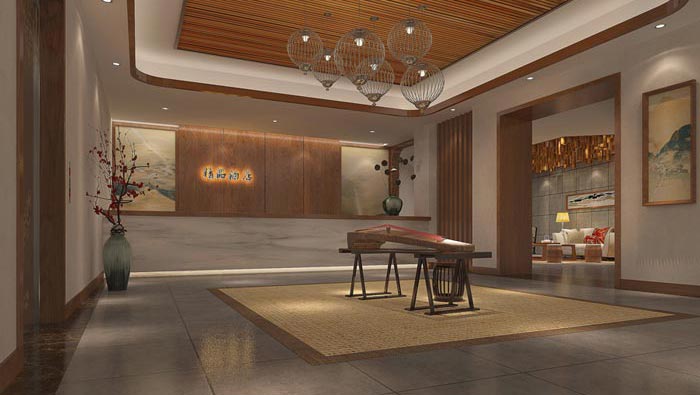 前臺(tái)區(qū)域的設(shè)計(jì):客戶進(jìn)入后會(huì)發(fā)現(xiàn)整個(gè)空間宛若一體,這也是中式風(fēng)格特有的氣質(zhì),因?yàn)橹惺斤L(fēng)格重在強(qiáng)調(diào)個(gè)體與整體之間的關(guān)系,并從中尋找到相互的關(guān)聯(lián),古箏被設(shè)計(jì)師放置在空間的正中央,白天琴聲悠揚(yáng),讓客戶聞聲進(jìn)入酒店之內(nèi)去傾聽,這也是酒店的一大特色。