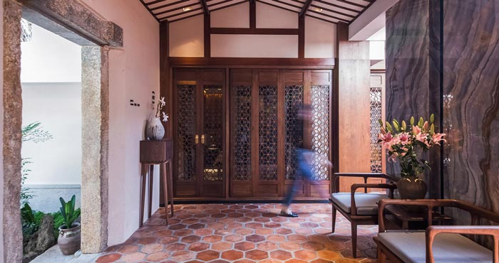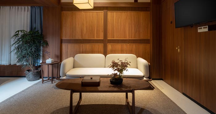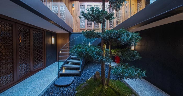 本次為民宅民宿設(shè)計(jì)項(xiàng)目,在設(shè)計(jì)中保留原建筑的柱網(wǎng)空間,同時(shí)以院落為中心,將空間劃分為四個(gè)客房區(qū)域,整體呈現(xiàn)中軸對稱的格局。