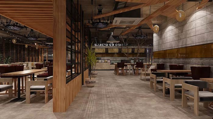 咖啡館過道裝修設(shè)計:一個大回字形的過道位于空間的進門區(qū),之所以這樣安排,是因為這樣的過道設(shè)計,可以兼容空間的四面八方,這樣的設(shè)計可以讓整個空間使用達到最大化。