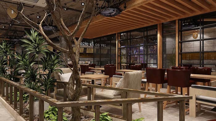 咖啡館樹木裝飾設(shè)計:樹木位于桌子的內(nèi)側(cè),之所以這樣安排,是希望讓客戶感受一下在大樹下看書的感覺,在鋼筋水泥的城市中,設(shè)計師希望拉近人與自然的關(guān)系。