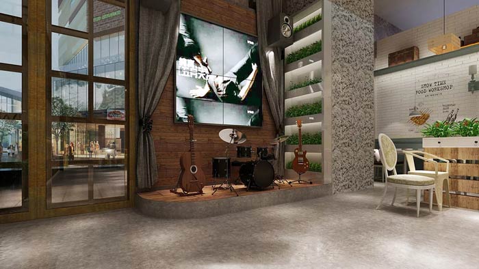 烤魚燒烤店音樂區(qū)設(shè)計:在進(jìn)入室內(nèi)的那一瞬間,優(yōu)美的音樂在客戶的耳邊響起,這不是音響中的音樂,而是真人動聽的音樂,這里提供聽歌與點歌,目的就是營造浪漫的就餐氛圍。
