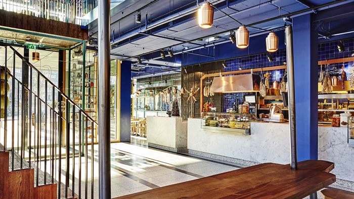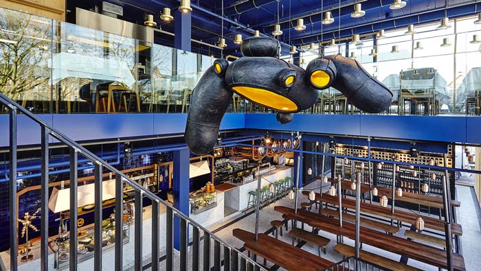 烤肉店啤酒罐設計:吧臺上懸掛著巨大的銅制啤酒罐,巨大的銅制啤酒罐懸在空中,精致而又豪爽,餐廳的一層空間如同啤酒屋般,洋溢著輕松自如的氛圍。