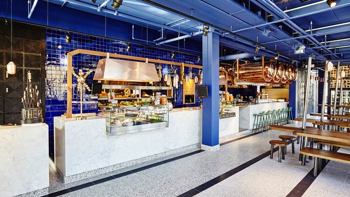烤肉店吧臺設計:設計師在設計中,將咖啡廳的吧臺模式融入空間之中,設計師希望烤肉店可以融入其他的元素在其中,在這里糕點、甜品、冷飲是對單一化的一種補充。