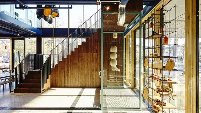 烤肉店樓梯設計:砧板材質肌理的樓梯,讓樓梯看起來更加結實,從樓梯處回看一層空間,巨大的姜塊飛船吊燈懸掛在空中,讓空間有了不一樣的韻味在其中。