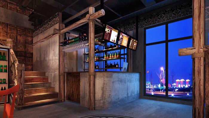 燒烤店窗外設(shè)計:這里是一樓與二樓的連接點,客戶在這里可以看到戶外的場景,空間環(huán)境的相互轉(zhuǎn)換,讓客戶仿佛置身于時間的滄海桑田之中,讓客戶感受生活的美好。
