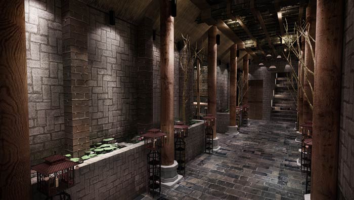 特色燒烤店過道設(shè)計(jì):中式講究的就是人與自然、空間與自然之間的關(guān)系,過道有柱子、荷葉、小樹枝、燈籠,無不在訴說著這樣的關(guān)系,這里沒有繁雜,有的只是安靜、愜意。